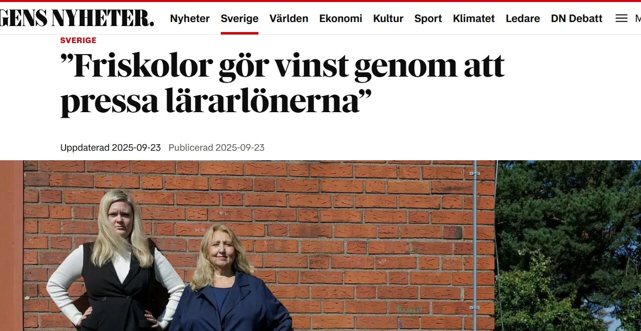 I Dagens Nyheter påstods häromdagen att lärare i friskolor har lägre löner än lärare i kommunala skolor. I artikeln sägs att ”lärare i fristående grund- och gymnasieskolor tjänar i genomsnitt 1 100 kronor mindre i månaden än sina kollegor i kommunala skolor.”