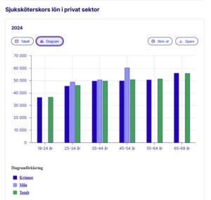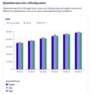 Sjuksköterskor i åldern 35-44 år anställda i offentligt driven verksamhet tjänade år 2024 i genomsnitt 41 100 kr per månad, medan de som jobbade i privat driven vård tjänade 49 700 kr. De privatanställda tjänade alltså 8 600 kronor mer i månaden. Liknande skillnader finns i alla ålderskategorier utom för de yngsta, där lönerna är lika höga.